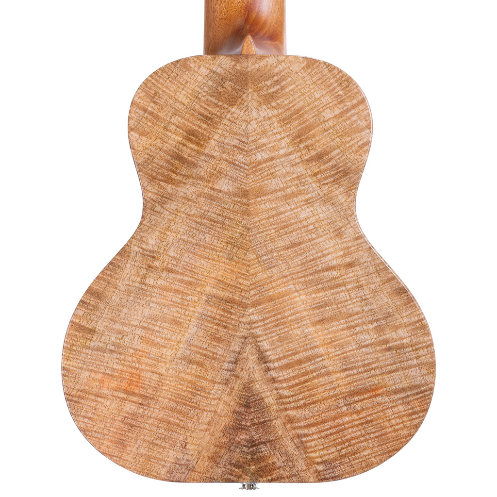 The Custom Tenor Italian Spruce/Curly Hawaiian Mango GL6 is a beautifully crafted guitarlele that blends tonal brilliance with striking Hawaiian aesthetics. Its Italian Spruce soundboard is responsibly sourced through Wood N’ Tones as part of their Abies Project. The Italian Spruce offers exceptional responsiveness, clarity, and dynamic articulation. Paired with Curly Hawaiian Mango back and sides, this GL6 delivers a warm, resonant tone wrapped in the natural beauty of island-grown figured wood. With TRU-Reduction and TRU-R Bracing working together, the instrument provides remarkable projection, sustain, and balance across all six strings.