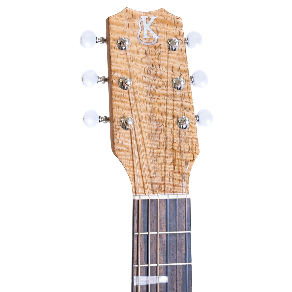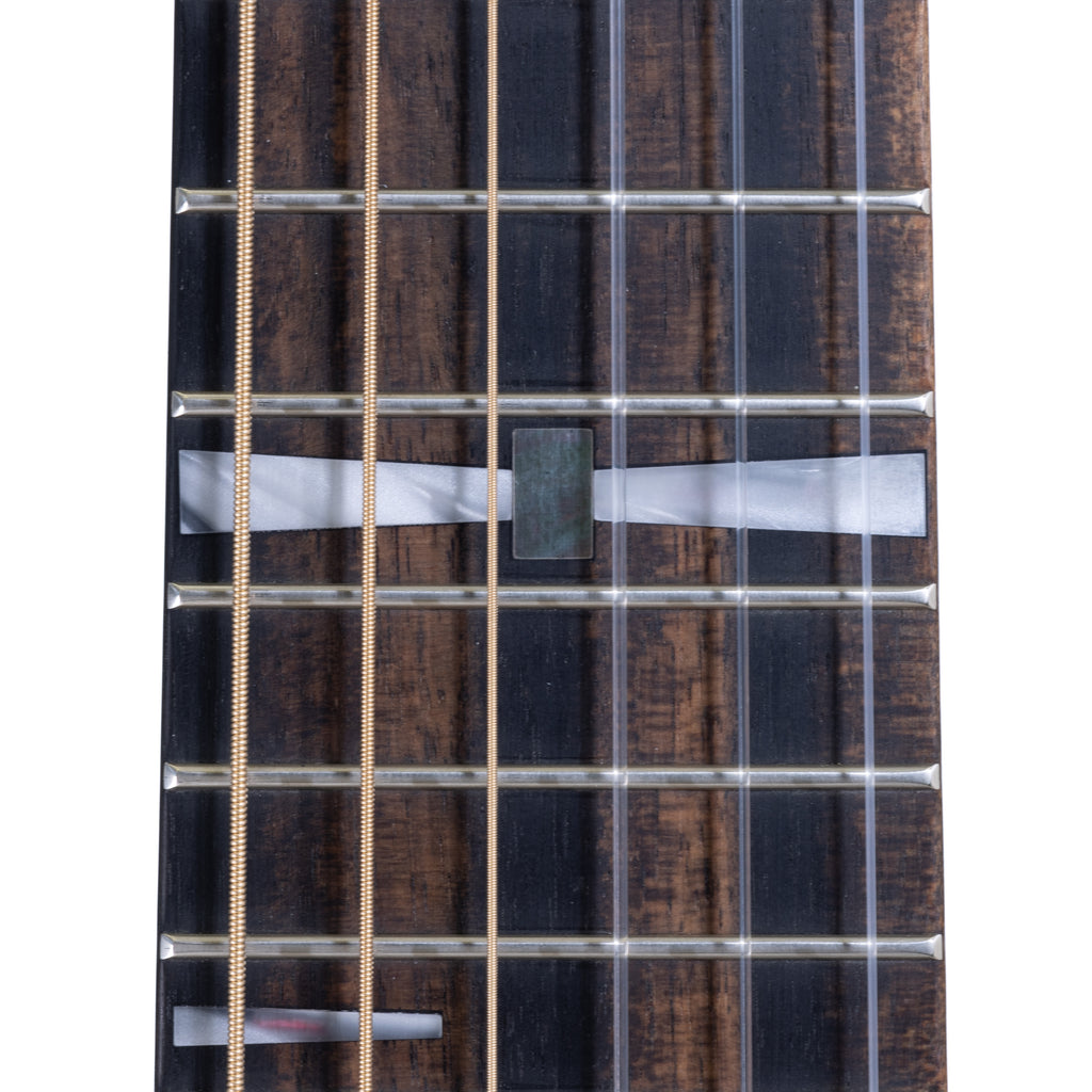 Refined details elevate both its appearance and playability, including a D-shaped soundhole, oval side port, Maple front binding, Maple bevel cutaway, and a matching Maple armrest for enhanced comfort. The Kanileʻa Crown headstock pairs perfectly with the Curly Mango headplate, while custom fretboard inlays offer a unique artistic touch. Finished in UV-cured high gloss with a silky smooth neck, the GL6 features Kanileʻa Open Geared Chrome Tuners, a White Mother of Pearl logo, and an Ebony fingerboard and bridge for long-lasting stability.