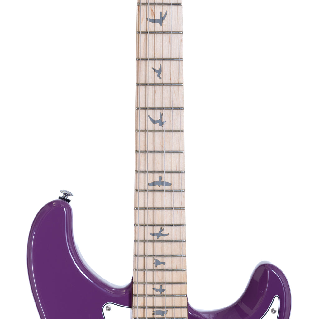The PRS SE Silver Sky Maple starts with a poplar body, bolt-on maple neck, and maple fretboard with PRS trademark bird inlays. The 22-fret, 25.5” scale length neck features the original 635JM carve and an 8.5” fretboard radius, so the PRS SE Silver Sky will feel right at home. Plug it in, and the three single-coil 635JM “S” pickups will bark and sing. This guitar is anchored by a two-point steel tremolo, synthetic bone nut, and vintage-style tuners. Other design features include the PRS Silver Sky inverted headstock shape and the PRS double-acting truss rod (accessible from the front of the headstock for ease of use). Ships with PRS Classic 10-46 strings and gig bag.